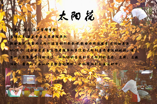 烛微尽善,从善如流,这是经济管理炸金花在线玩 的作品《太阳花》所要向大家传递的理念。这部MV有西农青鸟志愿者服务队参演,向所有人展示了一次完整的志愿活动经过。身为西农青鸟志愿者服务队的成员,该MV的全体制作人员都曾多次走进太阳村,也正因此,他们更明白里面的孩子经历过怎样的歧视和虐待。太阳村里的孩子都是服刑人员未成年子女,这个身份让这些本该天真烂漫的孩子们遭受着难以想象的苦难。他们有的流浪;有的为人放牧;有的沿门乞讨;有的不被亲属接纳,遭受虐待......出演人员表示,沉重地压在孩子们身上的,是‘父亲或母亲入狱’这个标签。如果不引起人们的关注和重视,在孩子们未来的人生路上,更遥远的歧视有时还在等着他们。这也是他们制作此MV的原动力,他们希望能够通过此MV,吸引更多的人加入到志愿活动中,为孩子们带去欢声笑语。