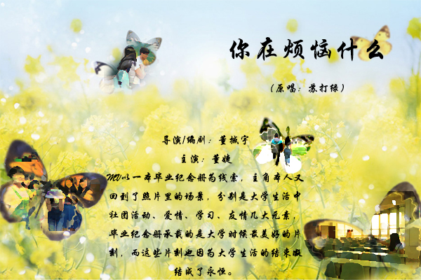 一本小小的毕业纪念册,满载着大学四年的美好时光。作品《你在烦恼什么》就为大家呈现出了大学时候最美好的片刻。而该MV的导演兼编剧董撼宇表示,自己虽然只是一名大一学生,并无法完全理解大学生活结束之后的那种怀念之情,但是自己也完全能够理解大学生活中的社团活动、爱情、学习、友情等诸多因素的珍贵。参与MV拍摄工作的都是自己的身边的同学,大家朝夕相处,熟悉彼此,像兄弟姐妹一样一起工作,彼此用各自的肩膀互相支撑,大家有共同的兴趣,共同的目标,愿意在工作之余互相倾诉又互相倾听,每个人都是发自内心的关心和真诚,大家曾一起顶着炎炎烈日完成拍摄工作;一同商讨怎样拍摄会使得效果更好;也曾共同为拍摄过程中遇到的种种困难愁眉不展,最终共同面对;也曾为拍摄完成而狂喜不已,欢呼雀跃......他相信,这一段经历,这一份友谊,待自己毕业之后也定会珍视如初,像MV中的主人公那样将这份美好的回忆凝成永恒。