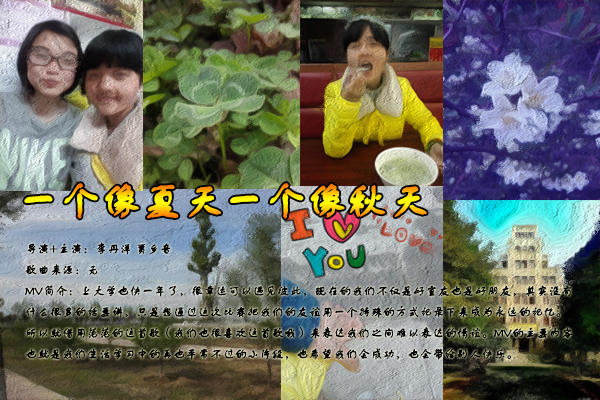 有一种友情希望到永久,即使青丝变白发,也能在心底深深保留。范玮琪的《一个像夏天一个像秋天》在李丹洋和贾乡音二人手中成了将二人的友谊化作永恒的回忆的一种特殊的方式,当问及为什么参加比赛时,二人表示,她们只是单纯的想要见证她们的友谊,相识近一年,她们一直携手走过,她们有共同的兴趣爱好,共同的理想目标,每个人都是彼此的知己,所以她们想要通过这种特殊的方式记录下二人的友谊。这部MV由她们两个人自导自演,因为人数少,所以拍摄过程非常艰难,各种困难接二连三的出现,曾经那个也想过要放弃,但是她们彼此鼓励安慰,相互支撑,坚持了下来。二人的友谊也在拍摄的过程中更加深厚,她们想要对彼此说,不管未来有多遥远,成长的路上有你有我,我们是永远的朋友。