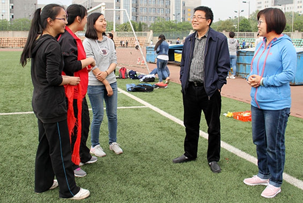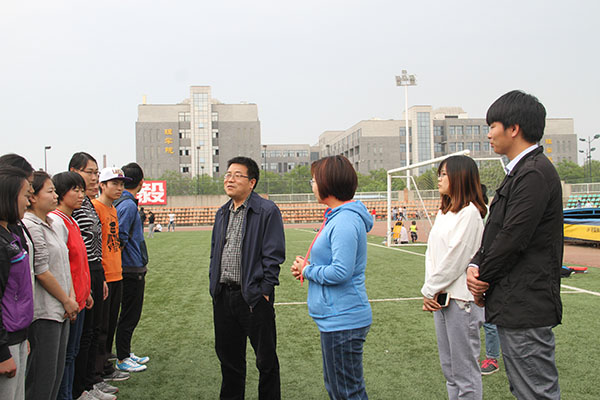 4月19日下午,炸金花在线玩 党委书记赵延安、党委副书记王晓娟及全体专兼职辅导员来到北校区田径场慰问为备战校运会的春训运动员及方阵训练人员。