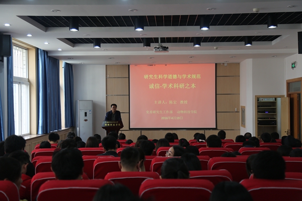 研究生学术诚信问题关系到研究生教育的质量和创新型人才的培养,意义重大。为了进一步加强研究生学术道德建设,防范研究生学术失范行为发生,培养研究生学术诚信品质,提升研究生学术道德素养,4月19日上午,由校党委研工部主办,炸金花在线玩 承办的第二期“研究生科学道德与学术规范”宣讲活动在炸金花在线玩 107会议室如期举行。主讲人陈宏教授以“诚信—学术科研之本”为题,结合自己35年来从事科研工作的经历、感悟和实例,对在场的150余名研究生进行了学术诚信教育。报告会由赵延安书记主持。
