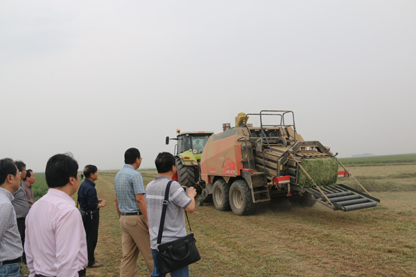 国家牧草产业技术体系咸阳牧草综合试验站与大荔县爱德生态农业有限公司通过五年的合作,结合当地草业生产实际,大胆探索,技术创新,成效显著。一是改春季播种为秋季播种,提高苜蓿出苗率,增加了生物量;二是改条播为撒播,拟制了杂草生长,提高苜蓿质量。技术推广后,苜蓿干草亩产量由原来的500公斤提高到1000多公斤,蛋白含量达到18%以上,品质达到了国际一级标准,价格却只有国外进口品种的 65-73%;三是全程大型机械化。目前该公司苜蓿种植规模已达1万亩。