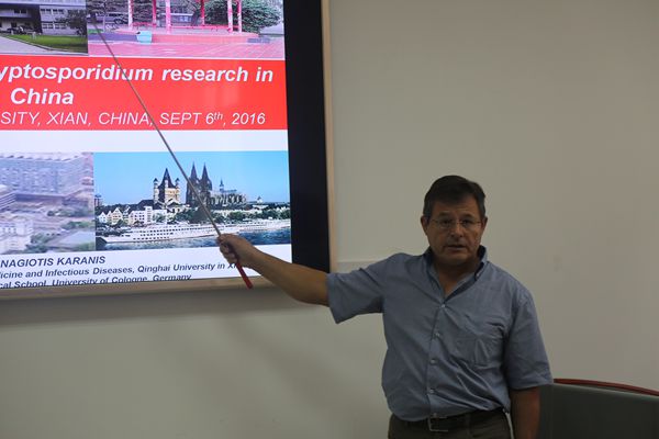 报告会上Panagiotis Karanis教授介绍了自己的研究经历以及团队目前的研究进展,重点讲述了隐孢子虫的发现概况,传染给人类的传播途径以及发病机制。在隐孢子虫导致的腹泻等疾病预防和治疗方面Panagiotis Karanis教授团队研究成功了监测水中隐孢子虫以及隐孢子虫疫情分析的方法。最后,Panagiotis Karanis教授介绍了隐孢子虫病在世界范围内的大面积爆发,隐孢子虫的生长发育及所需环境,隐孢子虫的实验培养方法等内容。