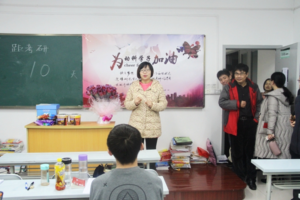 “考研倒计时10天”,几个大字赫然写在8号楼考研自习室的黑板上,2017届毕业生考研已经进入最后冲刺阶段。为进一步帮助考研学子调整心态、树立信心、坚持不懈、攻克难关,取得优异成绩。动科炸金花在线玩 党委书记赵延安寄语广大考研学子,党委副书记王晓娟、毕业班班主任和全体专兼职辅导员走进考研自习室,为考研学子送上冬日的温暖与炸金花在线玩 深深的祝愿。