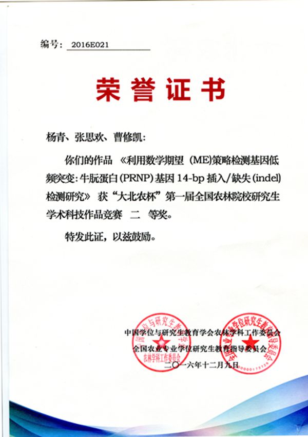 本次竞赛为全国首次全国农林院校研究生学术科技作品竞赛,征集的作品分为自然科学类学术论文、科技发明制作、哲学社会科学类社会调查报告和学术论文三大类,共吸引了全国36所农林高校的162件作品参赛,经评审,共有10件作品获特等奖,20件作品获一等奖,60件作品获二等奖,72件作品获三等奖,10个高校获优秀组织奖。该竞赛以“激励学科创新服务社会需求,推动人才培养加速成果转化”为宗旨,倡导农林高校研究生理实并重、刻苦钻研、积极探索,培养科研创新精神和实践能力,促进农林高校研究生学术水平提高,助推学术创新上有作为、有潜力的优秀人才培养。研究生杨青、张思欢和曹修凯团队首次提出利用数学期望(ME)方法检测基因低频突变,通过基因突变验证,发现其具有高效、准确、经济、快速等优点,并把相关结果发表在2016年国际期刊prion杂志上。该成果将数学理论与分子生物学知识背景联系起来,提出运用数学的理论解决生物体基因低频突变检测效率低等问题,进而利用生物学实验验证方法可行性,提出一种新的生物疾病基因检测方法,对畜牧业生产和分子育种有重要理论和实践意义。