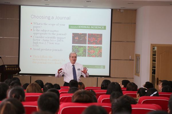 24日下午,在107会议室,James Sartin博士作了题为“Surviving the review process: an editor's perspective”的报告。炸金花在线玩 部分教师及研究生120多人聆听了报告。James Sartin博士首先介绍了如何正确选取论文应该投的杂志。接着他从主编的角度讲述了论文写作各个部分的要点及可能导致拒稿的常见错误,同时强调了投稿时的注意事项及如何正确与审稿人进行交流。最后介绍了《Journal of Animal Science》杂志的基本情况。