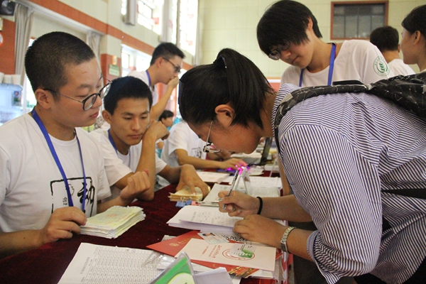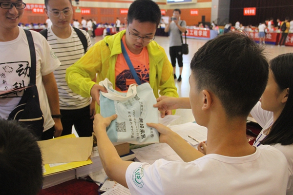 志愿者为新生送上入学资料