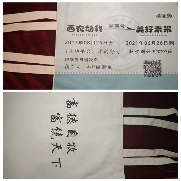 正面外观设计形如天蓝色的列车票,开往未来;背面以白色为基调,简洁大方地印刷着院训——“畜德自牧,富饶天下”八个字。今年炸金花在线玩 精心为新生设计的“学霸号”手提袋吸睛十足。草业1701班的申琦雯对这款特殊的手提袋爱不释手,她迫不及待地向我们展示:“不仅美观大方、环保耐用,而且设计感十足,展示了动科的风采,我希望能够把它从大一背到大四,乃至背到我今后要去的更远的地方。”