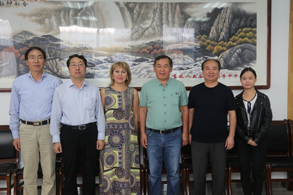与北哈萨克斯坦动物与作物研究所Ayup Iskakov所长(右三)、国立大学农炸金花在线玩 院长Altyn Shayakhmetova教授(左三)合影