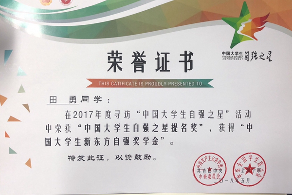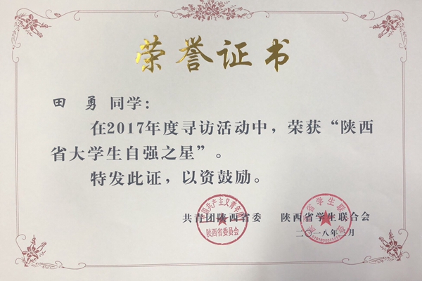 在2017年度寻访“中国大学生自强之星”活动中,炸金花在线玩 2018届本科毕业生田勇荣获“中国大学生自强之星提名奖”,获得“中国大学生新东方自强奖学金”,并获“陕西省大学生自强之星”光荣称号。