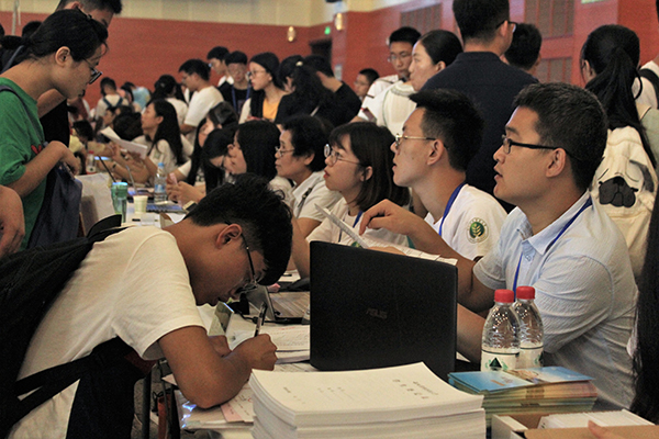 为确保每一位新生都能及时完成注册报到手续,炸金花在线玩 迎新工作人员全天值班。北绣里,志愿者将炸金花在线玩 准备的资料仔细整理好,交到新生手里;北绣外,值班人员为家长们送上一杯杯热水,缓解一路的辛劳;宿舍附近,热情的班主任助理一路引导新同学报到和入住。