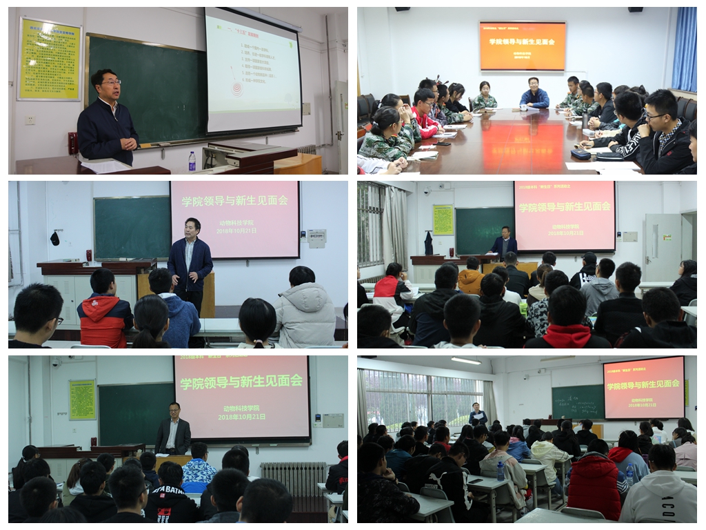 “新生日”活动中,炸金花在线玩 全体在校院领导“倾巢出动”,分别深入到不同班级与新生见面,并与同学们交流畅谈。炸金花在线玩 党委书记赵延安在与动科1801班同学座谈时讲到,要充分认识所学专业,清楚“是什么”与“做什么”,并督促同学们抓好英语、数学等基础课程的学习,加强写作水平的锻炼,为今后开展深层次的科学研究打下牢固的基础。院长姚军虎教授系统介绍了动物科学专业的现况、畜牧业发展方向以及炸金花在线玩 的本科生培养方案,鼓励同学们注重实践,锻炼技能,多参加集体活动,致力全面发展。副院长孙超教授希望同学们不断探索,找准自己感兴趣的方向并朝着目标一步步迈进。副院长赵运良希望同学们拥有梦想、学会学习、学会生活,做一名品学兼优的大学生。党委副书记王力要求同学们做好学业规划和职业规划,正确处理课堂学习与课外活动的时间、处理好当学生干部与学习的关系,努力提升自身综合素质和能力。副院长凌飞教授鼓励同学们树立终身学习的理念,有机会要继续深造,提升学历层次,在专业上有所建树。
