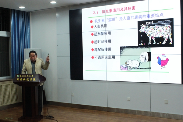 高玉鹏教授引用德国哲学家康德提出的“动物是工具,人是目的”的观点切入主题,详细剖析了曾轰动全国的三鹿奶粉事件和“瘦肉精”事件,并指出解决食品安全问题的关键在于动物食品“源头”的安全控制。高玉鹏教授表示:“畜禽数量爆发性增加、专门化品种特性的弱化等因素使得畜禽疾病越来越复杂,其后对抗生素的滥用进一步导致了食品安全问题日趋严峻。”