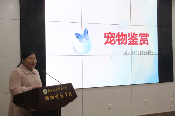 讲座伊始,王淑辉博士对宠物的定义进行了说明。她指出,以前的宠物只是单指人们为了消除孤寂或出于娱乐目的而豢养的动物,但现今人们更倾向于视宠物为出于非经济目的而豢养的动植物。随后,她从宠物的起源及宠物的种类进行阐述,详细的介绍了犬,猫,鸟,鱼四大宠物种类的习性及其特点,并围绕着犬、猫、鸟、鱼的形态、结构、特性和病理情况等多个方面对宠物进行了深入的介绍,带领大家认识到了宠物能够带给人类心理和生理上积极巨大的作用,它们与人类的生活密不可分,息息相关。但随着经济水平的不断提高、家庭饲养宠物的数量不断增长,逐渐产生了许多宠物咬人或被遗弃等现象,针对此类情况,王淑辉博士表示:“目前,有许多饲养者对宠物的习性和饲养技巧一知半解或者对宠物饲养的认识存在误区,因此导致了一些对于人类和宠物的伤害行为。深入了解宠物的习性与特征,是对一名宠物饲养者的基本要求。”