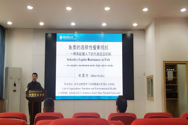 12月17日,华东师范大学杜震宇教授应邀来炸金花在线玩 进行了题为“鱼类的选择性瘦素抵抗——一种高能摄入下的适应性机制”的学术报告。报告在炸金花在线玩 107会议室举行,由凌飞副院长主持。