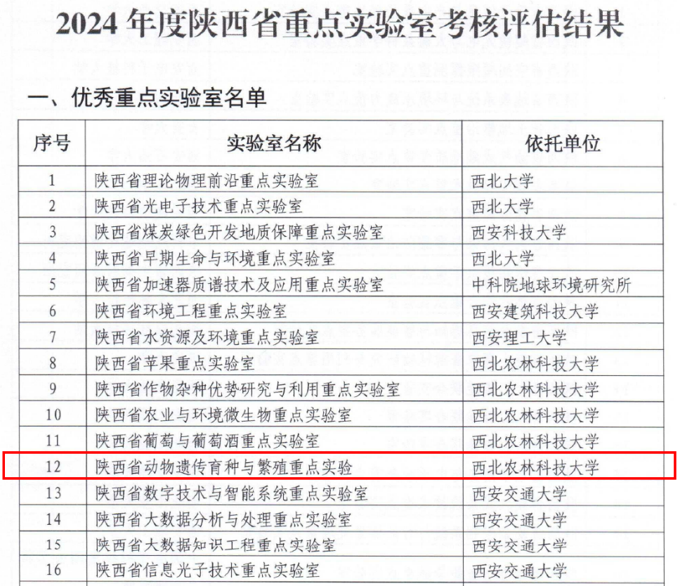 近日,陕西省科学技术厅公布了2024年度陕西省重点实验室考核评估结果,依托炸金花在线玩 建设的“陕西省动物遗传育种与繁殖重点实验室“在考核评估中获得优秀。